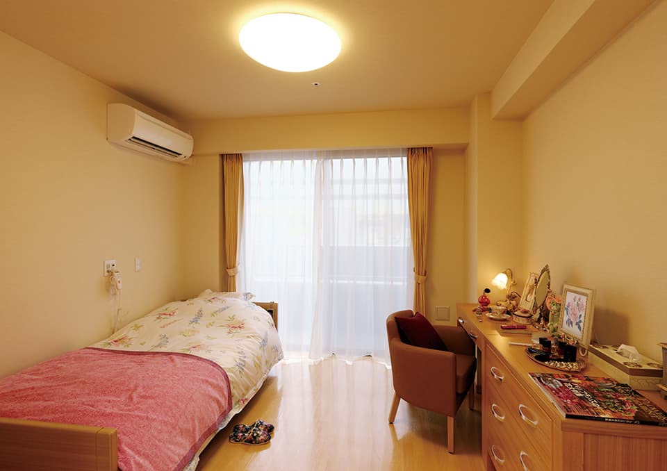 | 居室設備 | メモリーBOX、介護ベッド、緊急呼び出しボタン、トイレ、クローゼット、洗面化粧台、エアコン、照明、デスク、チェア、カーテン、ユニットバス、ミニキッチン ※ユニットバス、ミニキッチンはお二人様タイプのみ |