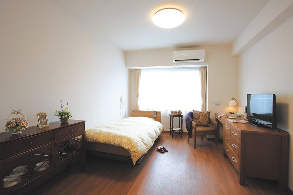 | 居室設備 | メモリーBOX、介護ベッド、緊急呼び出しボタン、トイレ、クローゼット、洗面化粧台、エアコン、照明、デスク、チェア、カーテン、ユニットバス、キッチン ※ユニットバス、キッチンはお一人様タイプ(ラージ)のみ |