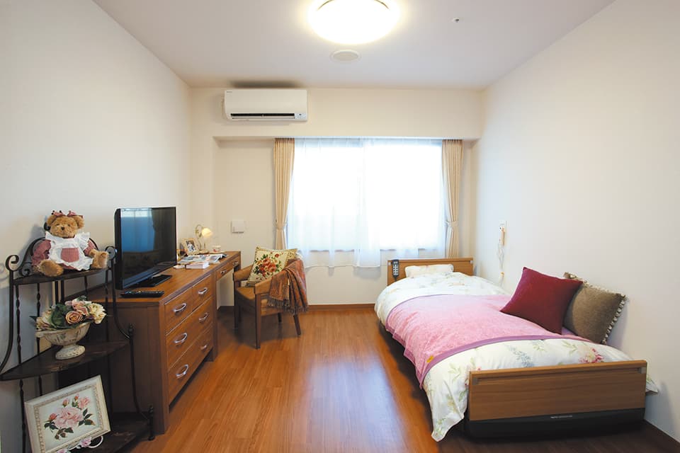 | 居室設備 | メモリーBOX、介護ベッド、緊急呼び出しボタン、トイレ、クローゼット、洗面化粧台、エアコン、照明、デスク、チェア、カーテン |