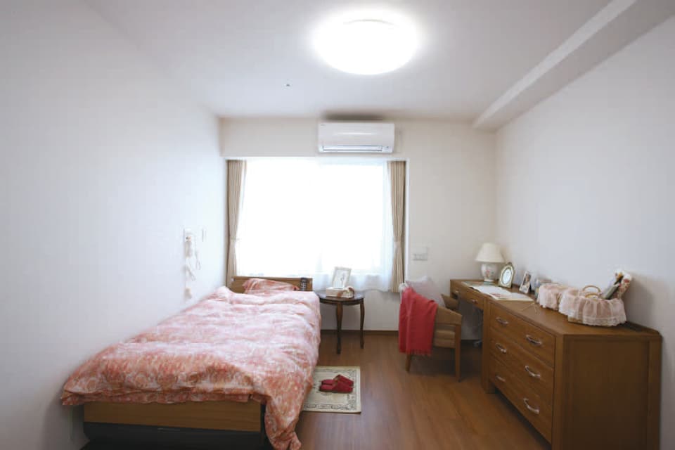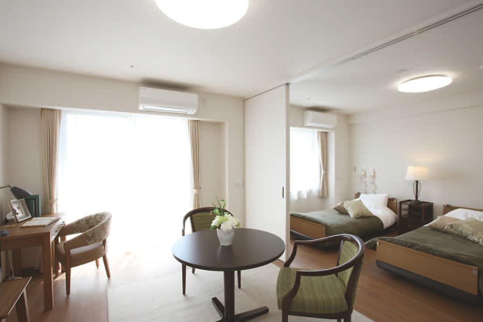 | 居室設備 | メモリーBOX、介護ベッド、緊急呼び出しボタン、トイレ、クローゼット、昇降式洗面化粧台、エアコン、照明、デスク、チェア、カーテン、ユニットバス、昇降式ミニキッチン ※ユニットバス、昇降式ミニキッチンはお二人様タイプのみ |