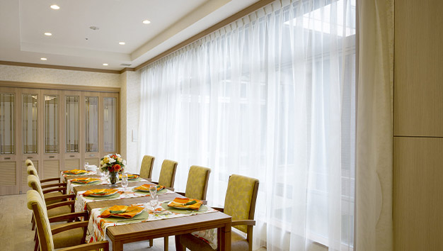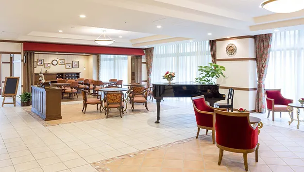 エントランスホールに続くカフェラウンジにはグランドピアノがあり、プロのピアニストが生演奏するカフェタイムを設けています。午後のゆったりしたひと時を、おいしいお飲み物とピアノの調べでお楽しみください。