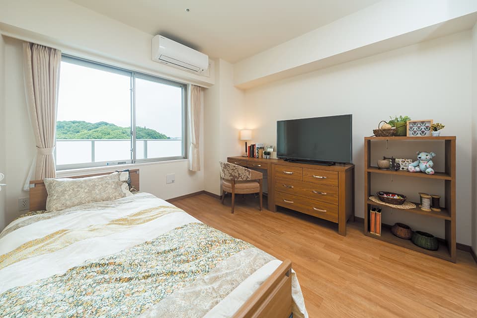 | 居室設備 | メモリーBOX、介護ベッド、緊急呼び出しボタン、トイレ、クローゼット、洗面化粧台、エアコン、照明、デスク、チェア、カーテン |