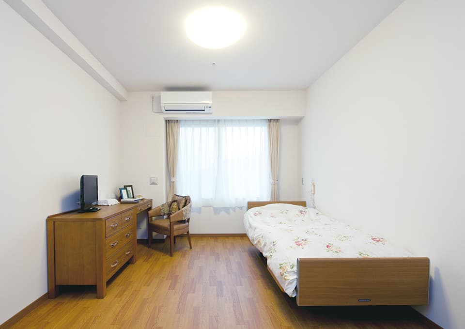 | 居室設備 | メモリーBOX、介護ベッド、緊急呼び出しボタン、トイレ、クローゼット、洗面化粧台、エアコン、照明、デスク、チェア、カーテン |
