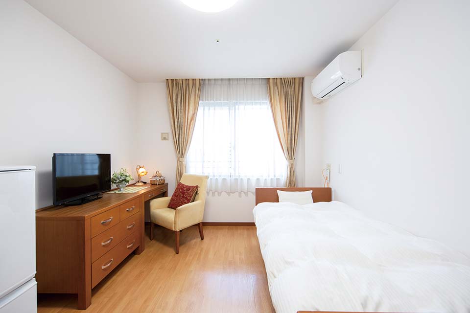 | 居室設備 | メモリーBOX、介護ベッド、緊急呼び出しボタン、トイレ、クローゼット、洗面化粧台、エアコン、照明、デスク、チェア、カーテン |