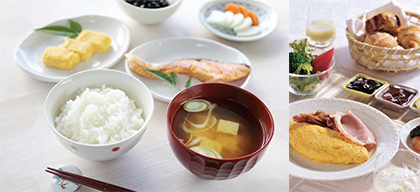 3食「できたて・アツアツ」で、栄養バランスの良い温かい食事を、館内の厨房から提供いたします。 調理から1時間半以内でしたら、お好きな時間、場所でお召し上がり下さい。 (配膳時間:朝食=7:30、昼食=11:45、夕食=17:45) 腎臓病食は補助食品を必要とする場合や、とろみ食はとろみ剤が実費となります。