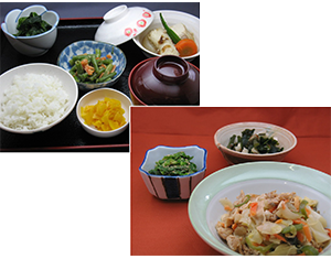 栄養士により考えられた、栄養バランスの良い温かい食事を、館内の厨房から提供いたします。 配膳時間:朝食=7:30~、昼食=11:30~、夕食=17:30~ お食事は皆さんと一緒に楽しくいただけます。 普通食からひと口、刻み、ミキサー、糖尿食、減塩食など柔軟に対応いたします。