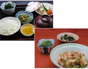 栄養士により考えられた、栄養バランスの良い温かい食事を、館内の厨房から提供いたします。 配膳時間:朝食=7:30~、昼食=12:00~、夕食=17:30~ お食事は皆さんと一緒に楽しくいただけます。 普通食からひと口、刻みなど対応いたします。 腎臓病食は補助食品を必要とする場合や、とろみ食はとろみ剤が実費となります。