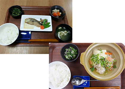 3食「できたて・アツアツ」で、栄養バランスの良い温かい食事を、館内の厨房から提供いたします。 朝食=7:30 昼食=11:30 夕食=17:30 腎臓病食は補助食品を必要とする場合やとろみ剤が実費となります。