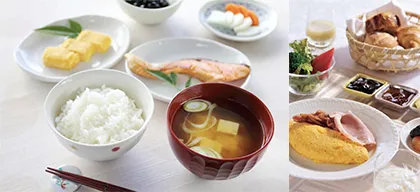3食「できたて・アツアツ」で、栄養バランスの良い温かい食事を、館内の厨房から提供いたします。 調理から1時間半以内でしたら、お好きな時間、場所でお召し上がり下さい。(配膳時間:朝食=7:30、昼食=11:30、夕食=17:30) 腎臓病食は補助食品を必要とする場合や、とろみ食はとろみ剤が実費となります。