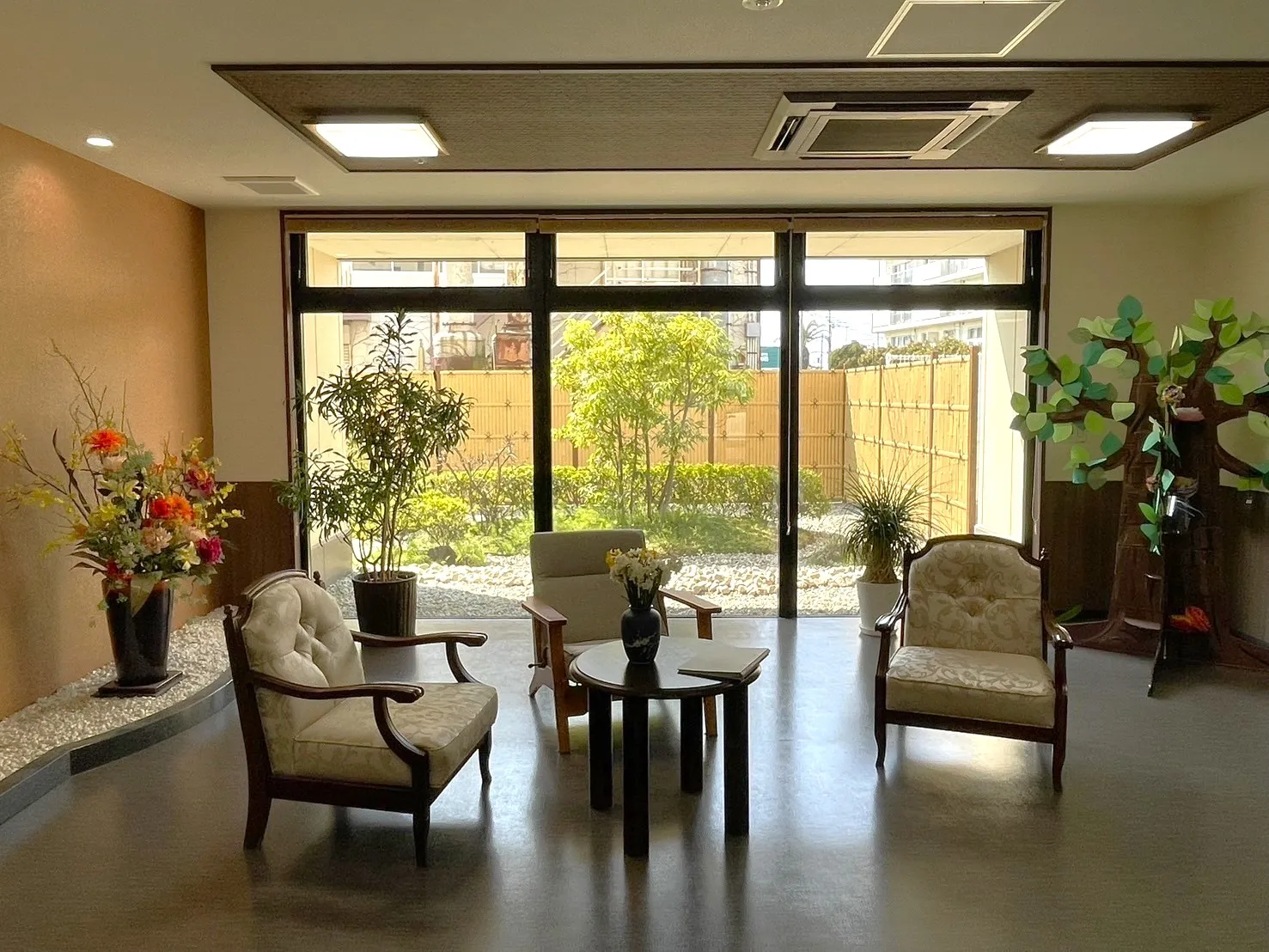 玄関内には緑豊かな坪庭を配置し、浴室の窓からは竹林が堪能できます。暮らしのなかに自然を取り入れ、生活に彩りを添えます。広々とした談話室や食堂には木製の家具を使用し、ゆったりとした時間を過ごせるよう演出。手すり付きの椅子や高さのあるソファで機能性にも配慮しています。各居室には緊急通報設備を2カ所設置。万が一のときにスムーズに対応できるよう備えています。入居者様の「これからの人生に華を咲かせる」をコンセプトに、安心できるサポート体制に加え、快適に過ごせる環境が魅力です。