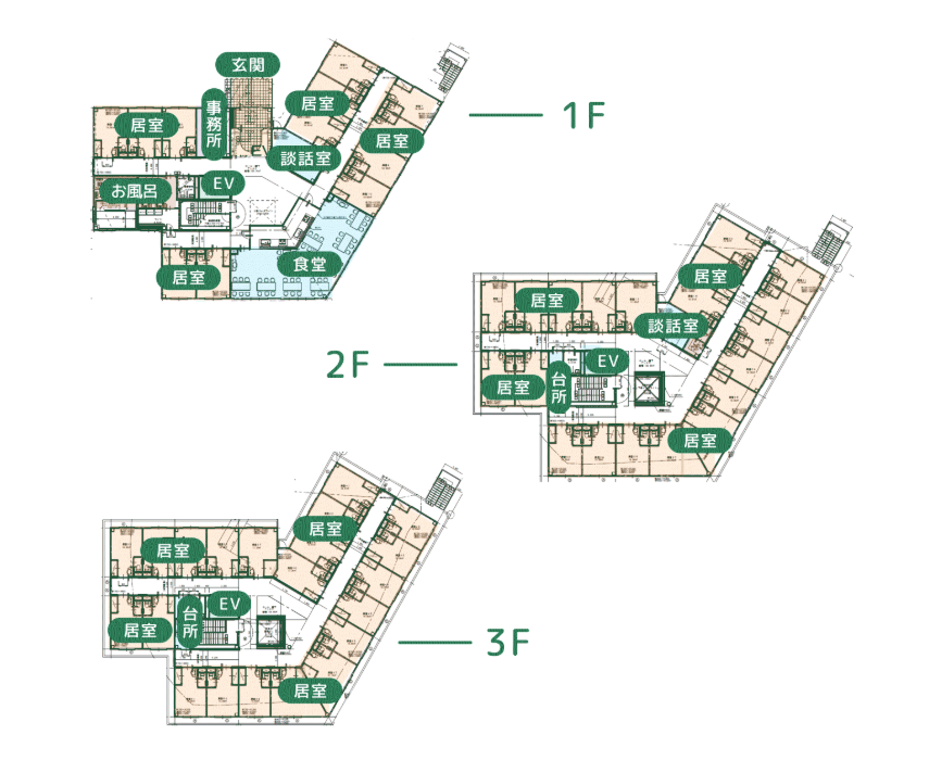 | 居室設備 | エアコン・トイレ・洗面・クローゼット・ベッド・ナースコールを完備 |
