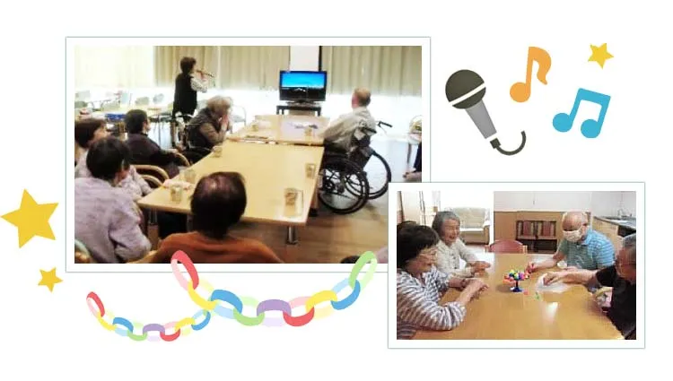レクリエーション活動で意欲の向上! おやつ作りや壁画などの作品つくりを職員と一緒に行いましょう!! 季節のイベントやカラオケも楽しみましょう!