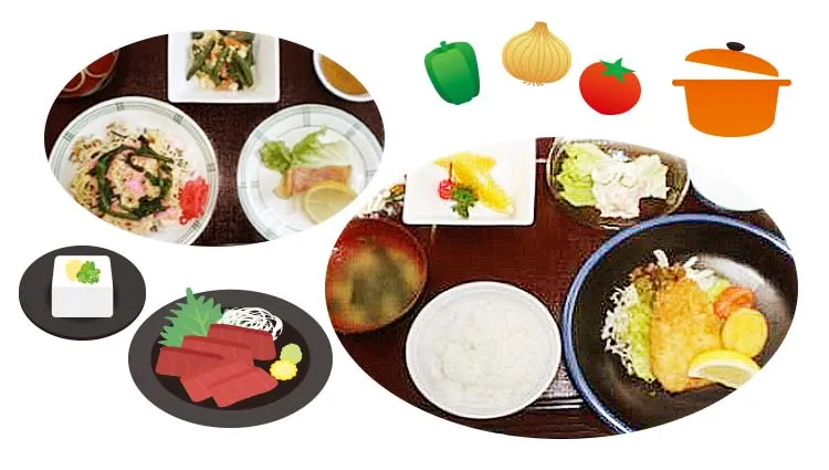 給食センターから、手作りのお食事を提供します。 お刺身は、ご好評を頂いています。