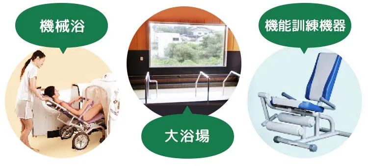 デイサービスを併設しています。 車いすや寝たきりの方もご入浴して頂けます。 機能訓練機器などをご利用頂けます。