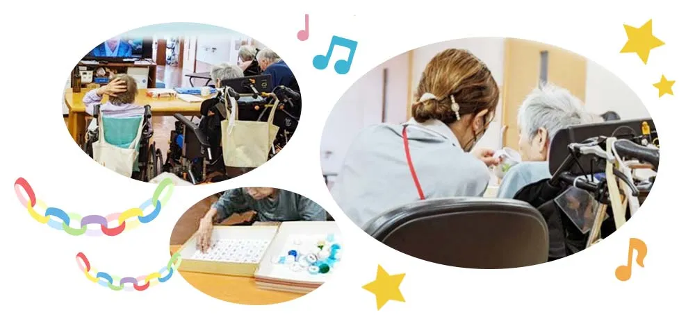 スロープ付きのおフロがあり、車いすでも安心・安全に! カラオケや運動機器も設置しています。 職員とも顔馴染みになりやすい環境です。 できるかぎり職員が近くでお話ができるように努めています。 ご入居者さまとの触れ合いを大切にしています。