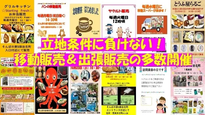 そんぽの家S保谷北町は近隣にお店がないという立地ですが、移動スーパーをはじめパン屋、弁当屋、花屋など様々な移動販売があります。 また、就労支援の団体の方の出店もあります。移動販売を通じて地域の方に、そんぽの家S保谷北町に興味を持っていただくことができ、 また、ご入居者さまも移動販売を楽しみに活動量が増えています。 当社の行動指針にある「地域とのかかわりを深め、ご利用者さまの地域での暮らしを支えるとともに社会づくりの一翼を担う」ことの実現ができているホームだと思っています。