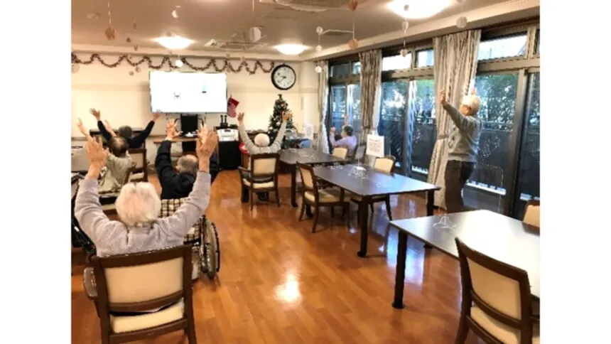 毎朝、食後に大画面テレビで映像を流し、皆さまとラジオ体操をしています。 ご利用者さま同士、誘い合って参加して下さり健康になりながら親睦を深めることができる 有意義な場となっているようです。