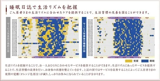 生活のリズムに合わせたケア、生活習慣の改善など、皆さまに寄り添ったサービスをご提供しております。 また、健康な生活を送っていただけるよう全居室に「睡眠センサー」を導入。 メリハリの利いたご生活をサポートいたします。