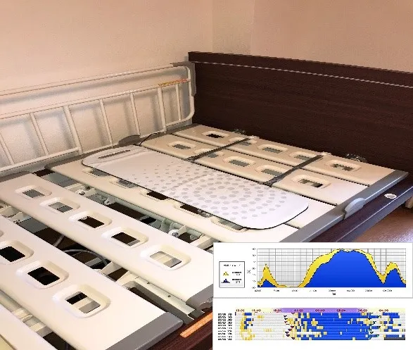 「睡眠センサー」 マットレスの下に設置したセンサーにより、体動(寝返り・呼吸・心拍)などを測定し睡眠状態を把握します。眠りSCANを使用することでケアプランの改善やケアスタッフの業務軽減、ご入居者さまの生活習慣の改善などにお役立ていただけます。