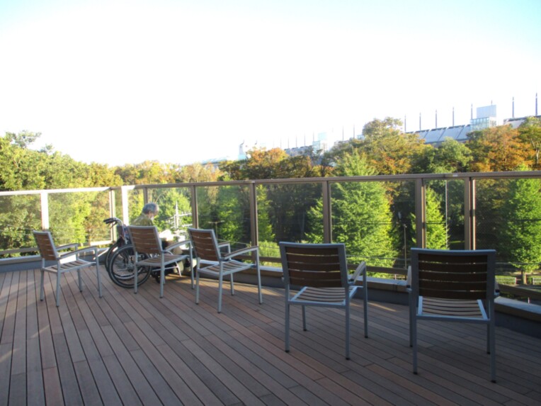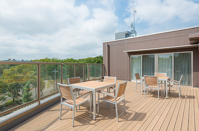 施設の4階には、競馬場が見えるテラスがあります。 緑あふれる景色のテラスで日光浴をして、気分も爽快です。 日光浴をしながら読書を日課にされている方もいます。 夏は競馬場の花火大会を特等席でご覧になれます。 目の前には自然が広がり秋には紅葉や、お月見などもおすすめスポットです。
