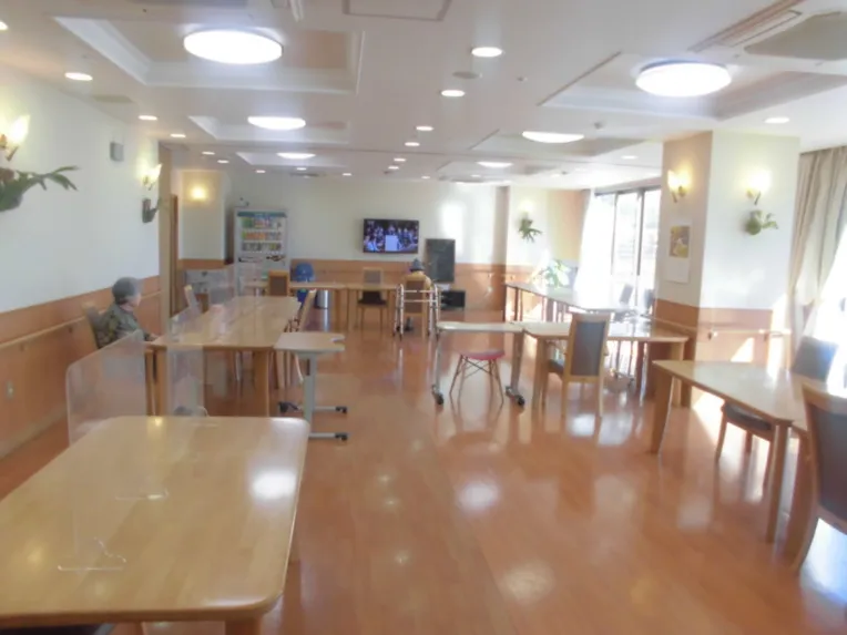 玄関入ってすぐに食堂がございます。南東向きの全面ガラスから陽光がふりそそぐ、明るく開放的な空間で食事を召し上がっていただくことができます。 仲の良いご入居者さま同士で談笑される姿も目にします。外観からは想像もつかない、空間を贅沢に使ったホームです。 また、体操教室や音楽セラピーなど様々なレクリエーションも食堂で催されるので、楽しみもありながら穏やかにお過ごしいただけます。