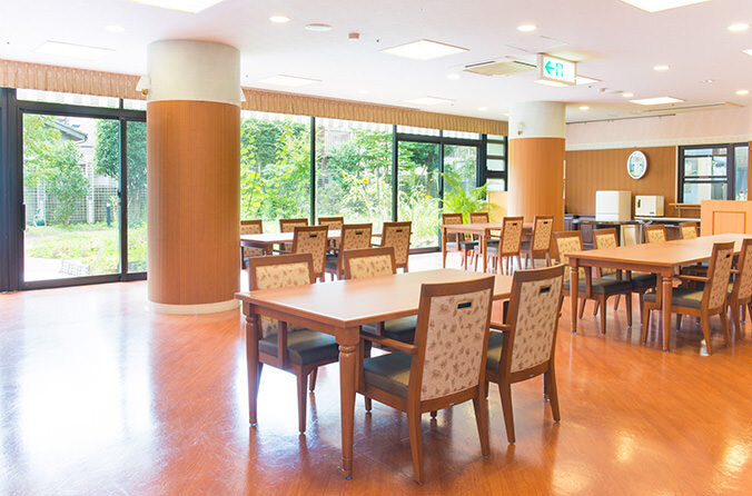 1階の食堂は窓が大きく、隣接する中庭から緑と陽の光が感じられ、陽気が良い日にはそこから中庭に出て外気浴も楽しめます。 お食事の時間には、お食事と共にお仲間同士の会話を楽しむ時間でもあります。