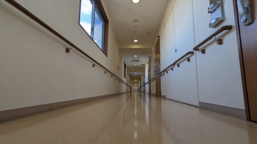 施設の廊下は50mほどあり、雨の日でもお散歩、軽い運動が可能です。 歩行にご不安がある方は歩行器やシルバーカーを使われても大丈夫! 訪問リハビリでも使用することもあります。