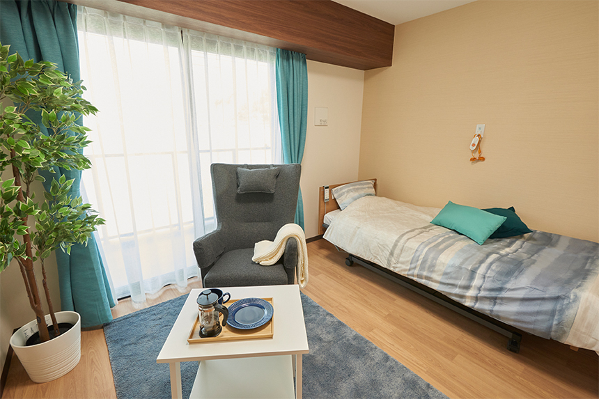 居室設備 | ミニキッチン、浴室、冷蔵庫置場、洗濯機置場、洗面台、トイレ、クローゼット、エアコン、緊急通報ボタン、介護用ベッド、睡眠センサー 他 |