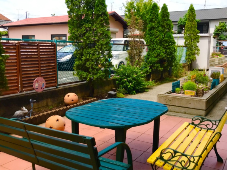 園芸療法を取り入れ、ご利用者さまと一緒に花を植える作業を行っています。 スタッフお手製のベンチやインテリアを揃えており、目で見て楽しめるを追及しています。お茶をしたり面会スペースとしてもご利用いただけます。