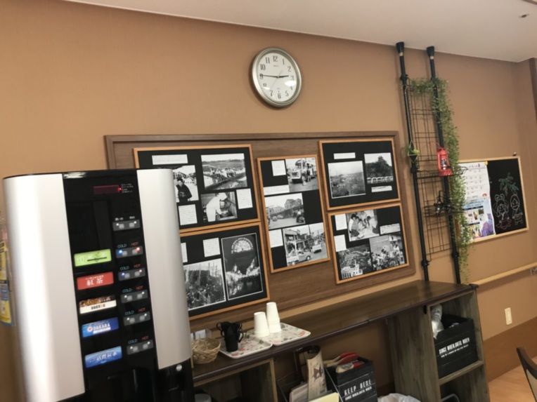 各階にドリンクバーを置いています。イベント時に合わせ新しい飲み物を追加したり、ご要望に合わせて入れ替えも行っています。 ドリンクバーの近くには目を引く掲示物があり、昔なつかしい空間には話題が広がり人が集まる場所となっています。