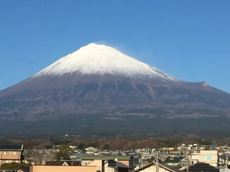 ホームのある富士宮市は富士山の麓にあります。春の霞がかった富士山や冬の雪化粧を纏った富士山はもちろんのこと、傘雲を被った富士山や、夕日や朝日で赤く染まる赤富士など、四季折々の富士山に出会えます。富士山がホームの北側に位置するために居室の窓から直接眺めることはできませんが、ベランダや庭から、もしくは散歩の際にご覧いただけます。写真はホーム屋上から撮影しました。