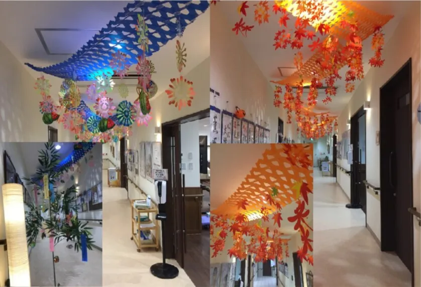 コロナ禍でも感染対策をしながら、季節に応じた行事を行っております。 特に食堂出入口の廊下では目で見てお楽しみいただけるようにご入居者さまと一緒に飾りつけを行っております。
