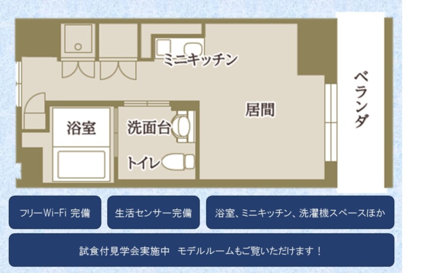| 居室設備 | 洗面台、トイレ、収納、下駄箱、浴室、ミニキッチン、洗濯機スペース、玄関収納椅子、エアコン、TV端子、インターホン、居室内センサー、緊急呼出装置、フリーWi-fi完備ほか |