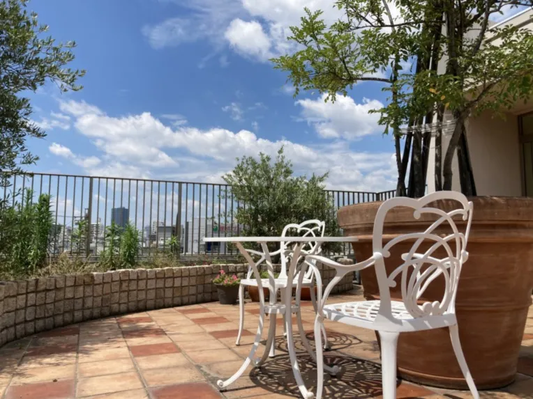 名古屋市の中心街である金山に当ホームはありますが、屋上に上がっていただくと緑に囲まれたお庭がございます。 都会を忘れて日光浴を楽しめるスペースです。