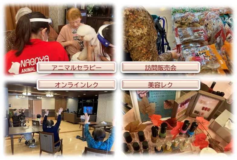 ホームでの生活の楽しみの一つとして毎日のレクリエーションをご用意しています。 体操や美容レクリエーション、移動販売、ドックセラピー等々。飽きの来ないレクリエーションを取り揃え、楽しんで生活をしていただけるよう企画しております。