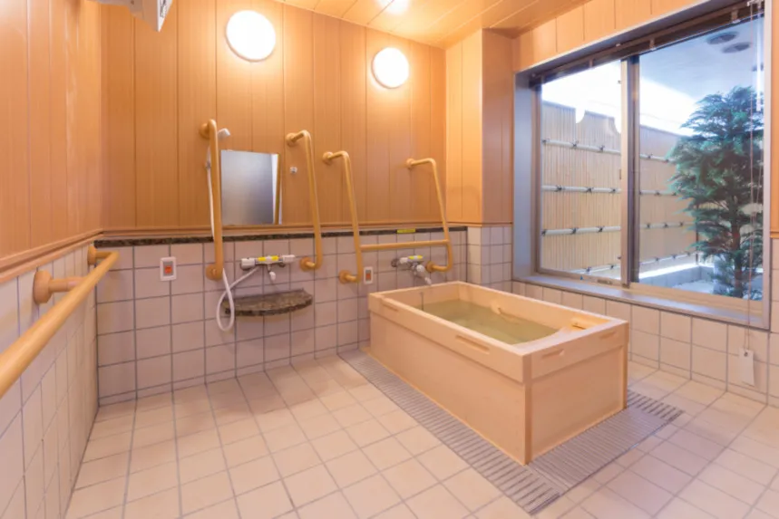 ラヴィーレ名古屋には檜のお風呂がございます。 日々の入浴にも楽しみを持っていただけるよう、浴室から綺麗な日本庭園風の景色も望めるようになっております。檜の香りに包まれながら入浴を楽しんでいただけます!