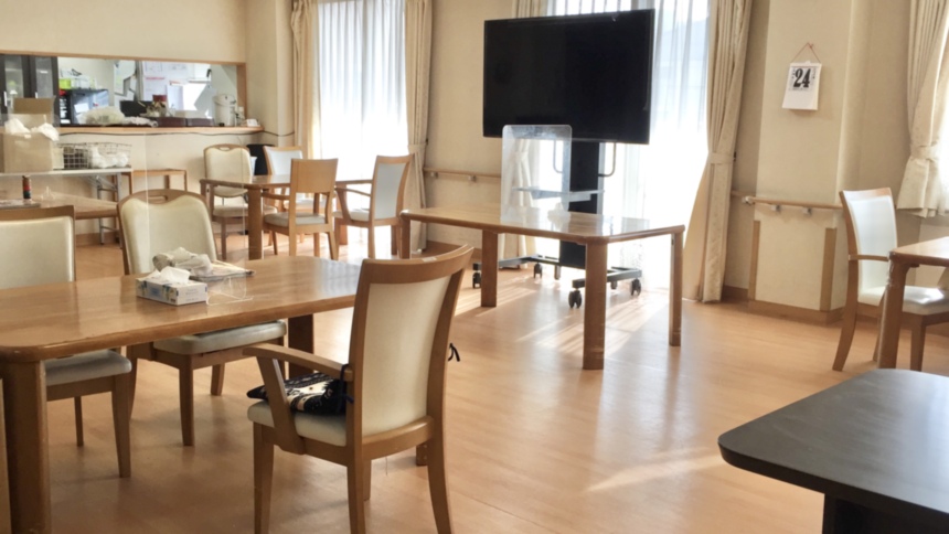 広い談話室で、ご入居者さまとの面会が可能です。 スタッフの研修や会議でも使用しています。