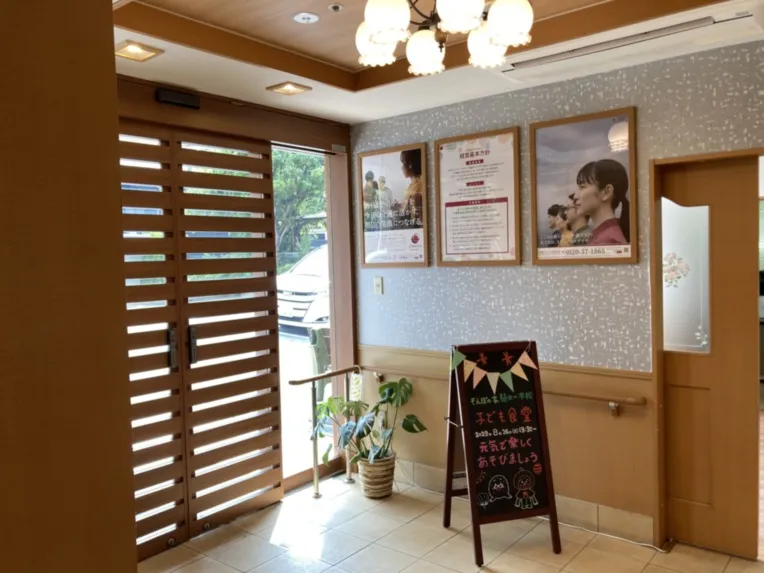 照明に工夫した玄関エントランスではウエルカムボードがございます、 ホームで開催するアクティビティや子ども食堂の案内などで、皆さまをお出迎えいたします。