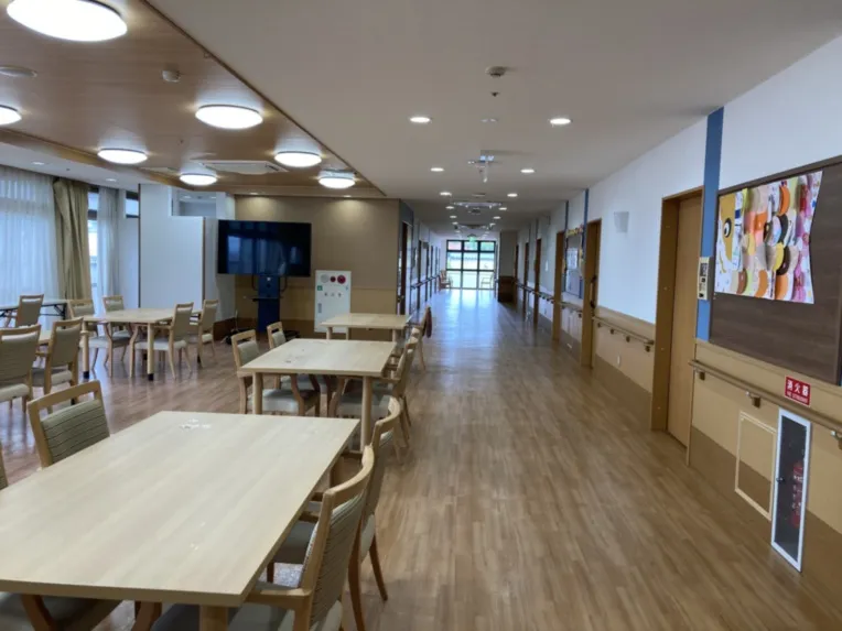 長い廊下を活用して、歩行練習などの生活リハビリができます。 廊下の中心にラウンジがあり、おいしいお食事を楽しめるほか、おしゃべりなど自由に過ごすことができます。