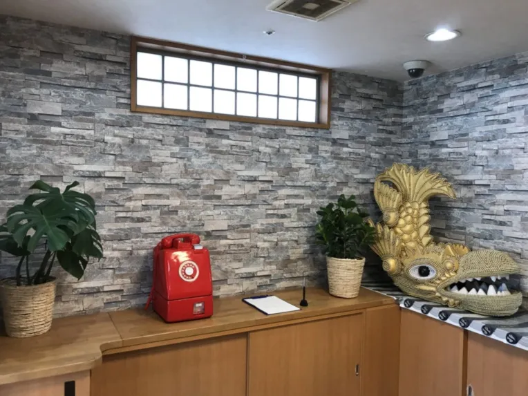 ご来訪いただきますと、懐かしい赤電話や名古屋を象徴する金シャチがお出迎えします。いずれもご入居者さまとスタッフの力作です!! ダイニングはコロナ対策を講じており、共同生活の場として安心してご利用いただけるよう準備しております。
