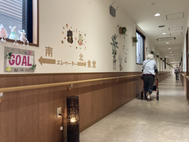 そんぽの家S常磐野の廊下は両サイドに手すりがあり、長さは約50mあります! 閉じこもりがちな雨の日や、夏の暑い日、冬の寒い日でも往復したら100mほど歩くことができます♪