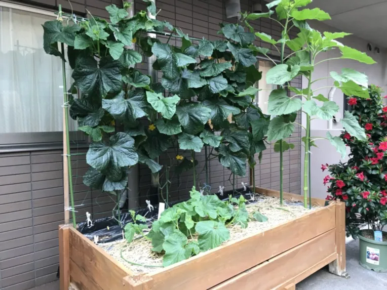 そんぽの家S 城東天王田には、家庭菜園がございます。 プロの指導員と一緒に、四季に応じた農作物を育て、収穫まで担います。 ご利用者さまは、土の感触を楽しみながら、作業されています。