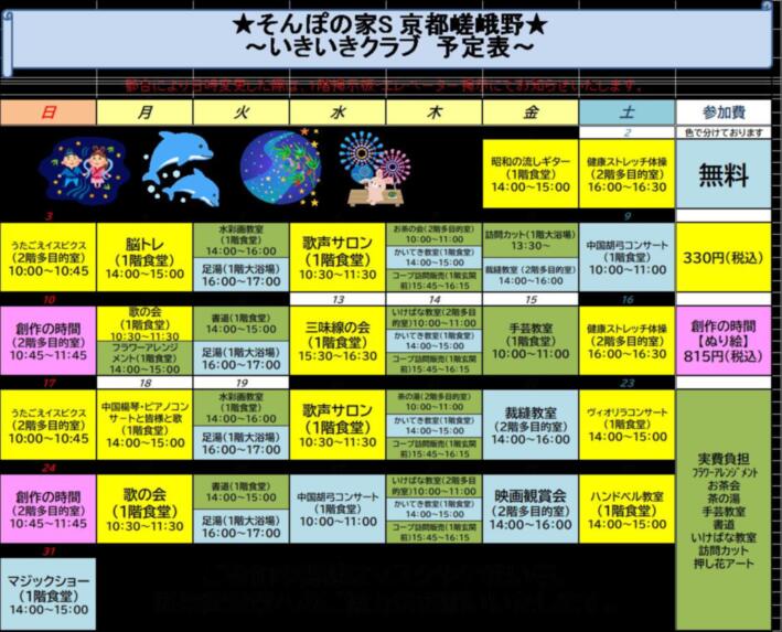 ホーム内で行われるイベントは盛りだくさん!! 参加したいイベントのみ参加して楽しむこともできます ! ホームの大浴場にて「足湯」のイベントをしたり、「歌」「体操」「手芸」等、さまざまなクラブ活動があります。 また、右京区 の介護予防推進センターと協力し、毎週地域の方も集まって体操を実施しております! ※スケジュール表は、一例となります。
