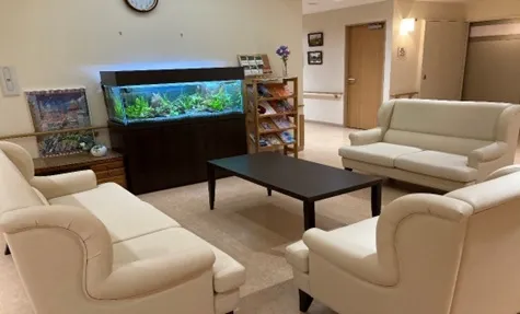 こちらは、そんぽの家S京都東向日の人気スポットです。 自然とご入居者さまが集う憩いの場となっております。アクアリウムを眺めながらのんびりとくつろがれたり、ご入居者さま同士で会話を楽しんでおられます。