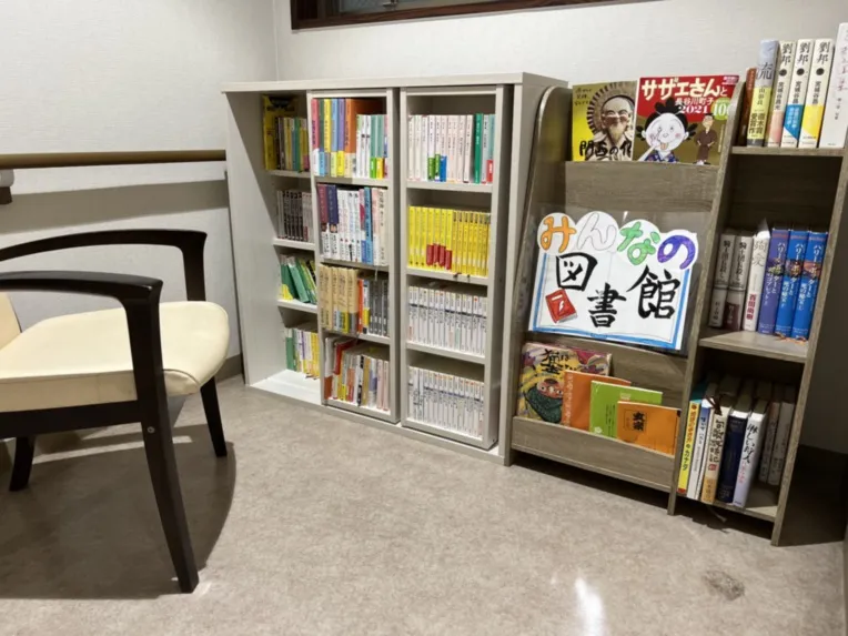 1階の空きスペースを活用し、図書コーナーを設置しております。 どなたでもお気軽にお楽しみいただけます♪