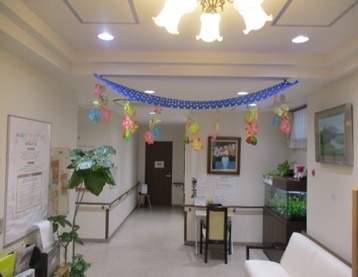 そんぽの家S東寺では季節ごとに手頭栗の装飾品を飾り付け、アットホームな雰囲気となっております。 また、食堂前に談笑するスペースを設けており、ご入居者さまがおしゃべりしたりテレビを見たりと、思い思いの時間を過ごされています。