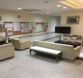1階エレベーター前のスペースです。 テレビを見たり、ちょっとした交流の場としてお使いいただけます。 相撲中継があるときは皆さまで楽しんでおられることが多いです。