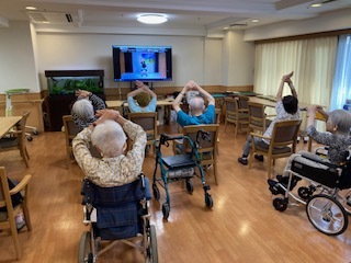 ホームではほぼ毎日、オンラインアクティビティを開催しております。 体操や音楽鑑賞・・・。様々なプログラムにより、日々ご入居されている皆さまに楽しんでいただいております。