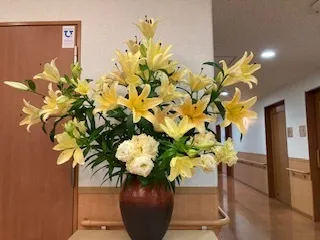 そんぽの家 伊丹荒牧では外部のお花屋さんが月に2回訪問してくださり、玄関先の大きな鉢にステキなお花を生けてくださっています。 いつも見ごたえのある仕上がりで、ご入居者さまも楽しみにされています。