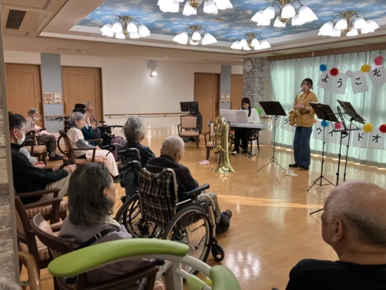 そんぽの家 住吉遠里小野では、演奏会や子ども食堂など 地域の方々をお招きして楽しい交流イベントを開催しています。 地域と繋がる事で暮らしに彩りを添え、 新しい出会いや感動が生まれます。